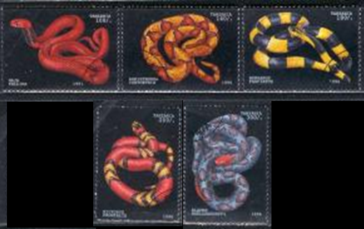 TANZANIA #1471 – 1476 1996 Serie incompleta falta #1475 «Serpientes»